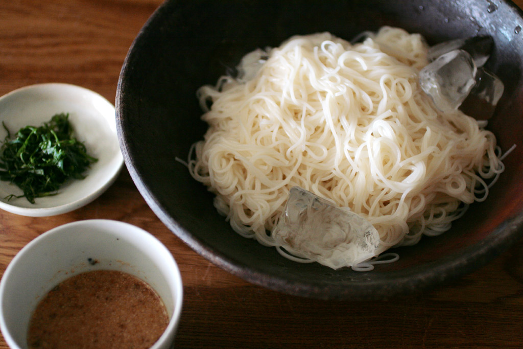 ごまの風味がよくて、ふつうのそうめんよりも、少しだけ食べ応えのあるそうめんである。