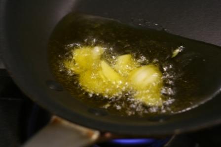 パスタ用のお湯を沸かしておいて、包丁の腹でつぶしたにんにくとオリーブオイルをフライパンにいれ、とろ火にかける。フライパンを傾けて、にんにくを低温からじっくり揚げるようにする。