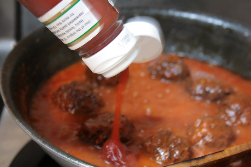 ごく基本的なトマトソースのスパゲティーに、ちょっとだけ甘みのケチャップを加える。