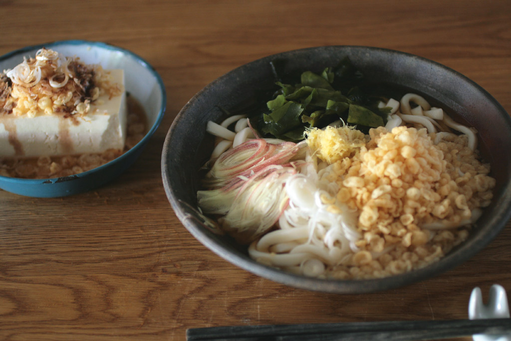 木綿豆腐にうどんつゆを張って、揚げ玉とかつおぶし、ねぎを乗せて、醬油をちょろりとかける。