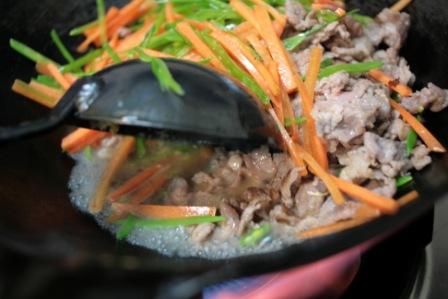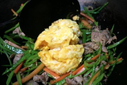 絹さや、にんじん、豚こま切れ肉、たまご、酒、塩、胡椒、醤油。