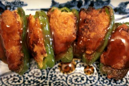 残った【たれ】に水溶き片栗粉を入れ、よく混ぜてとろみをつけ、ピーマン肉詰めにかけて、完成。