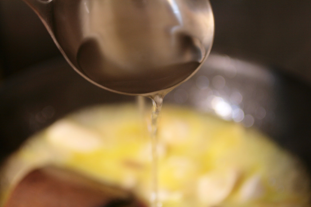 舞茸をグリルパンで焦げ目がつくまでじりじりと焼いて、酒・砂糖・醬油・だし・味醂のつけ汁でつけ焼きにする。