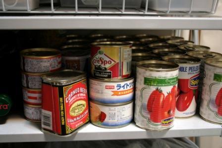 ホールトマト缶は30缶くらいある。コーンビーフ、ツナ缶など。