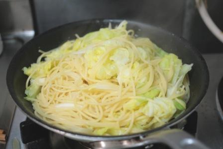 パスタの茹で時間が残り2,3分になったら、パスタ鍋にキャベツを入れ、一緒に茹でる。