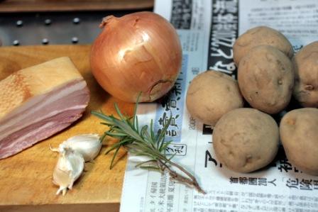 じゃがいも、たまねぎ、ブロックベーコン、ローズマリー、にんにく、オリーブオイル、白ワイン、塩、胡椒。