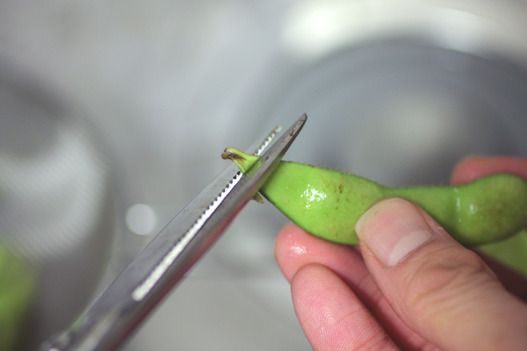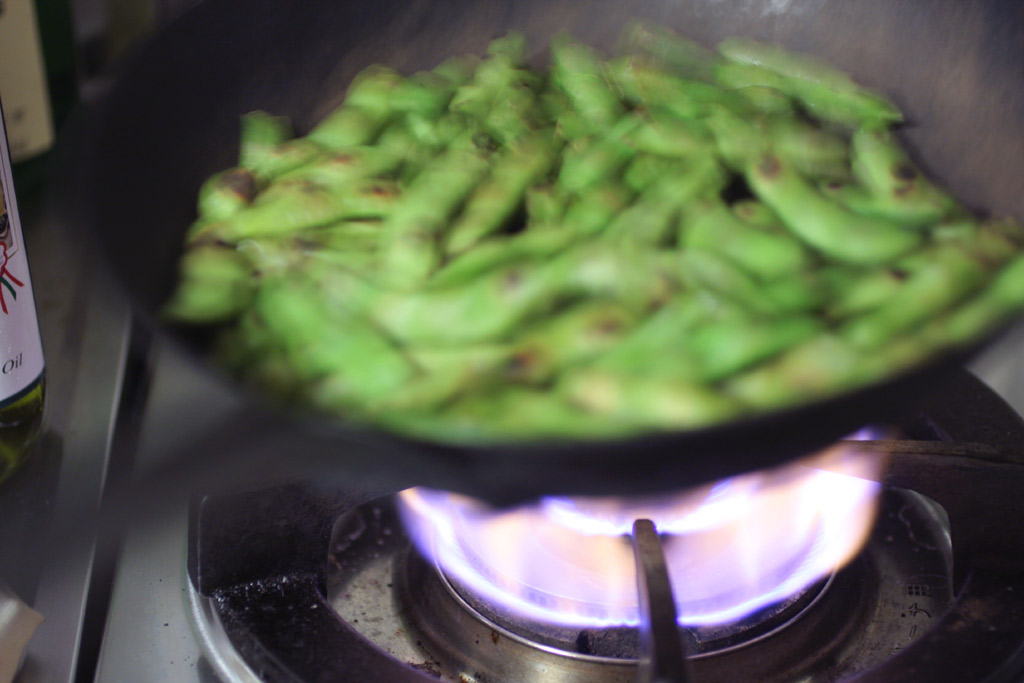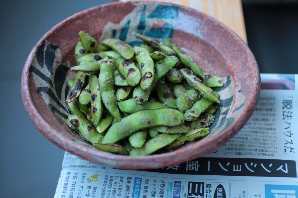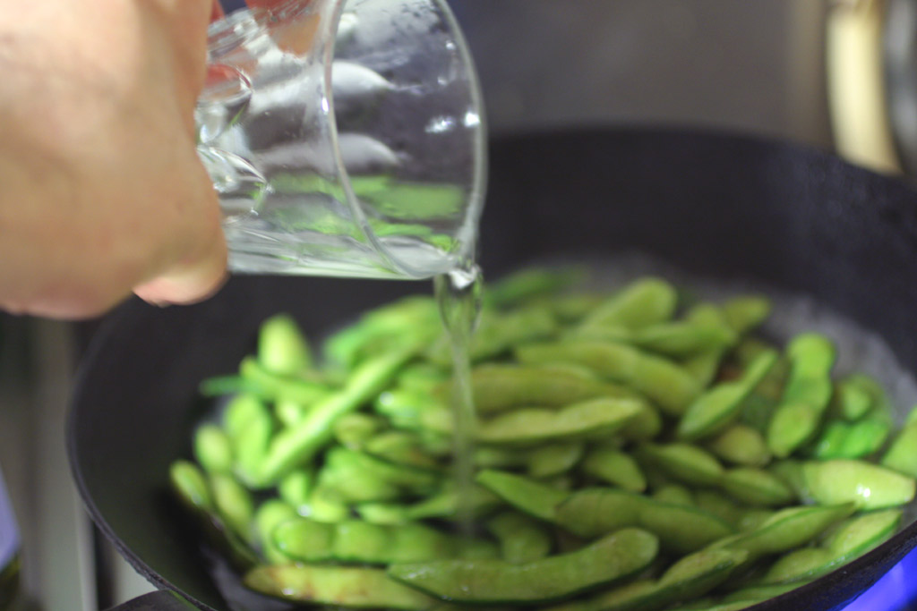 茹でるのではなく、フライパンで莢が焦げるくらいまで焼いた、香ばしく甘い枝豆を用意するのだ。