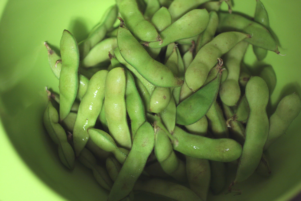 出始めの頃の枝豆は、見るとうれしいけれどやっぱりまだ痩せていて、なかなか手に取らない。これくらいふっくらしているほうが、気持ちも盛り上がるというものである。