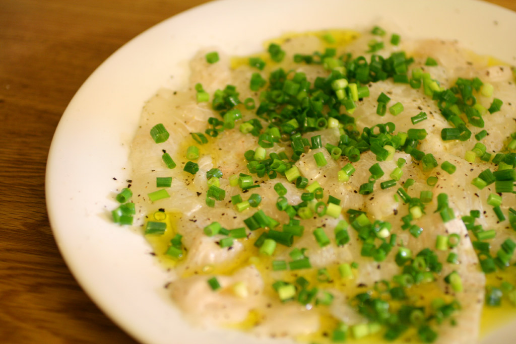 カルパッチョは、斜めにそぎ切りにした平目をさらに並べ、塩、胡椒を気持ち強めにふって、レモンを搾る。オリーブオイルをたっぷりかけたら、あさつきを散らして完成。