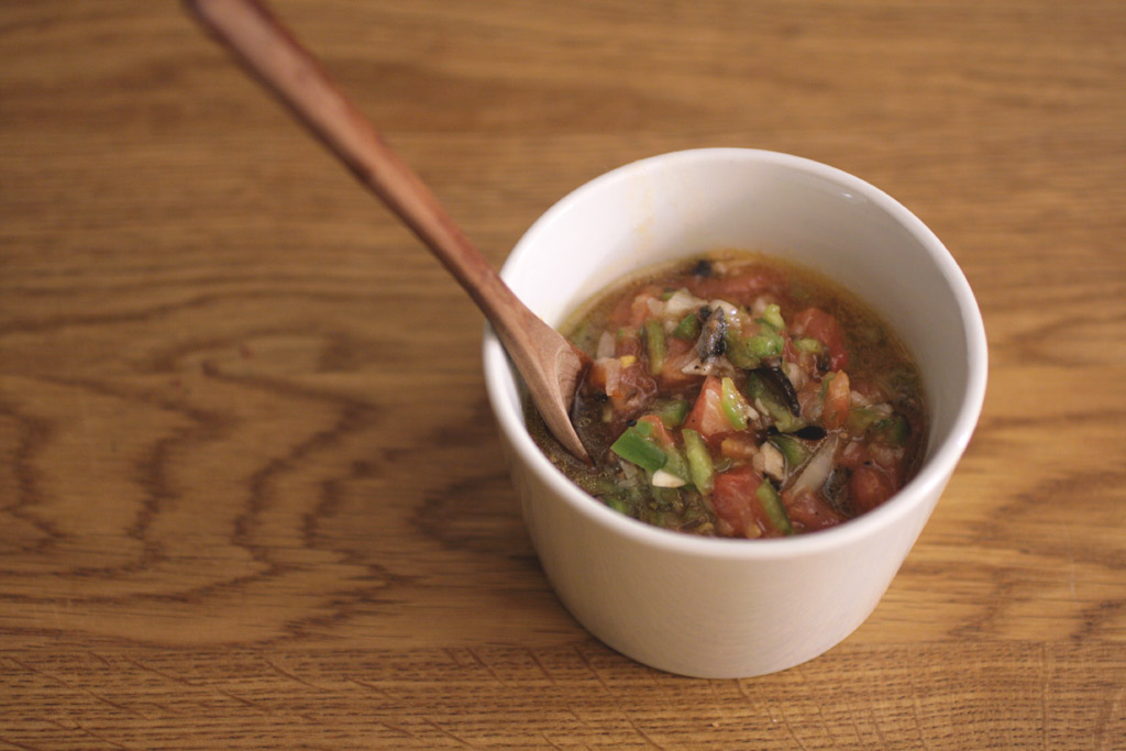 皮を剥き、みじん切りにして水気を切ったトマトと、にんにく、ピーマン、ブラックオリーブをみじん切りにしたもの、塩、胡椒、クミンシード、レモン汁、オリーブオイル、そしてマリー・シャープスを入れる。