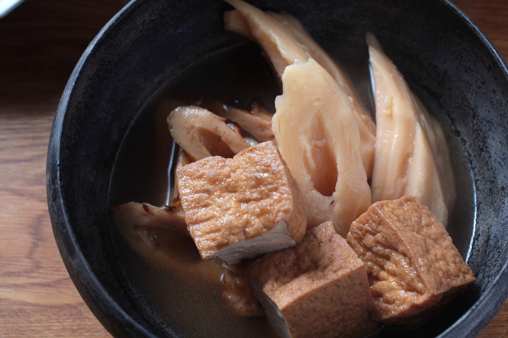 これは前にも紹介したことがある、ちくわとちくわぶの煮物。今回は厚揚げも一緒に煮てある。前日の残りものなので、しっかり染みている。