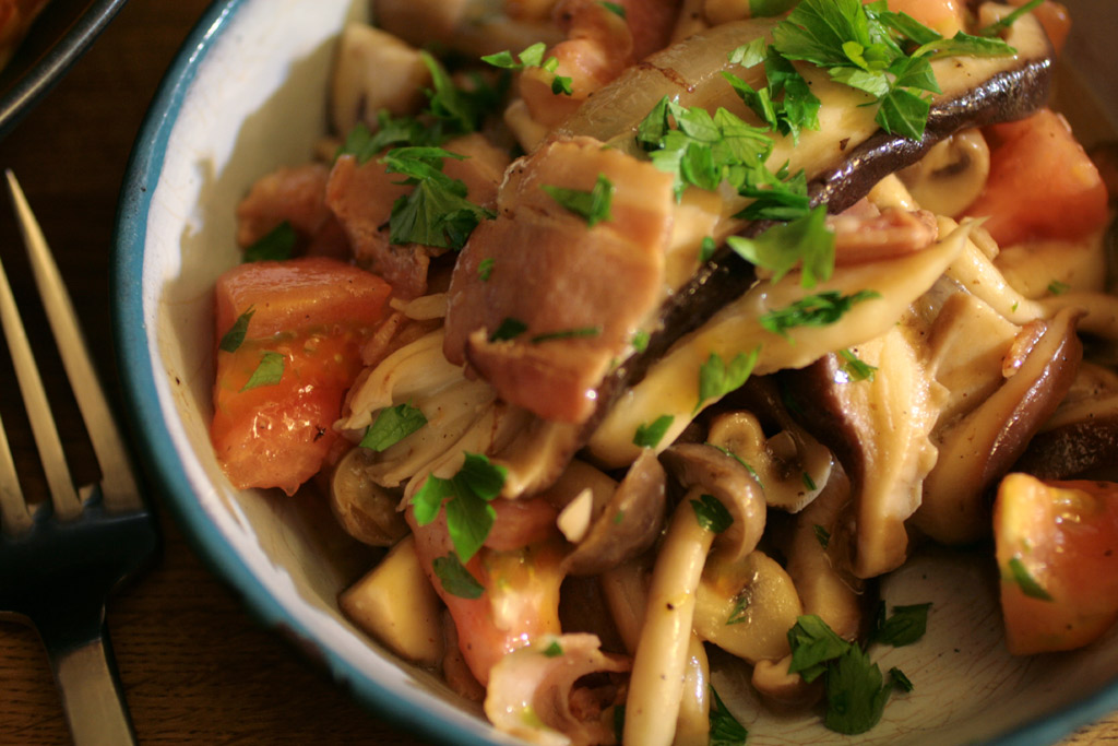 きのことベーコンと生トマトを炒めたらとてもおいしかったこと。