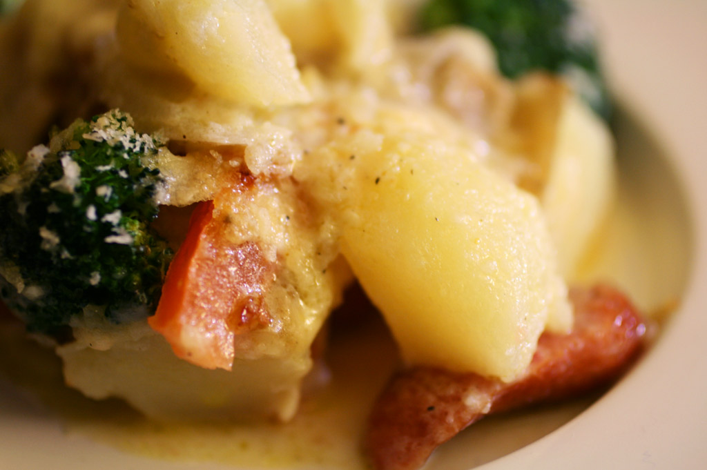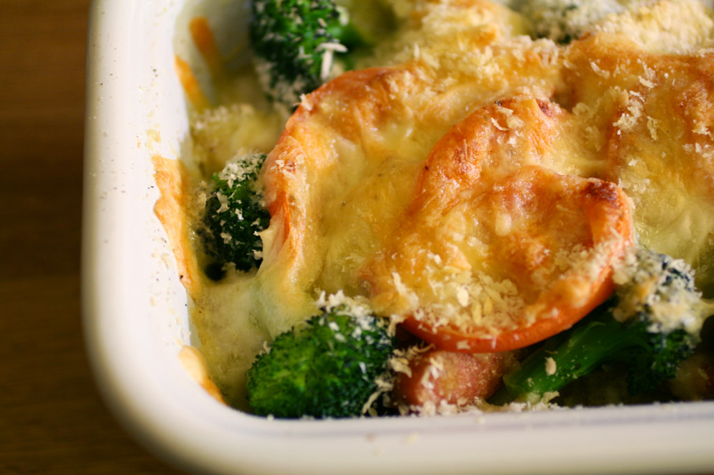 耐熱皿に、じゃがいもとウインナ・ソーセージ、トマト、軽く茹でたブロッコリーを並べ、ピザ用チーズ、パルミジャーノレッジャーノのすりおろし、パン粉をかけてオーブンでいい焦げ目がつくまで焼く。