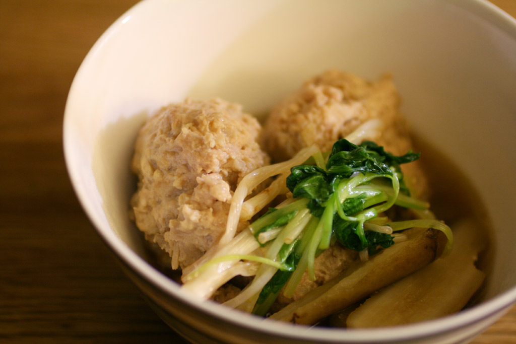 鶏つくねは、鶏ひき肉、れんこんのみじん切り、たけのこのみじん切り、しょうがのみじん切り、酒、塩、全卵、片栗粉を混ぜ合わせ、よく練る。粘りが出て白っぽくなるまでひたすら練る。