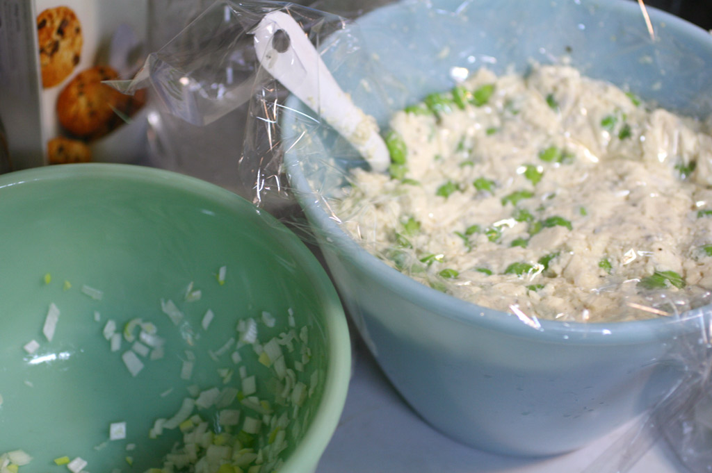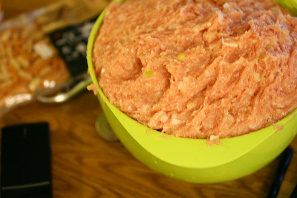 ねぎのみじん切り、片栗粉、酒、全卵、しょうがの搾り汁を入れて練る。