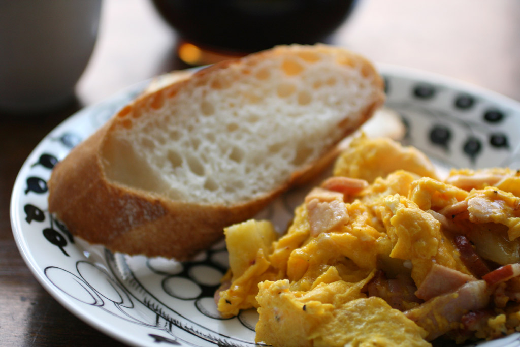 フライパンにバターを融かし、ハムとじゃがいもを炒め、塩、胡椒で味を調えたらたまごを加えて半熟になるまで炒めて完成。