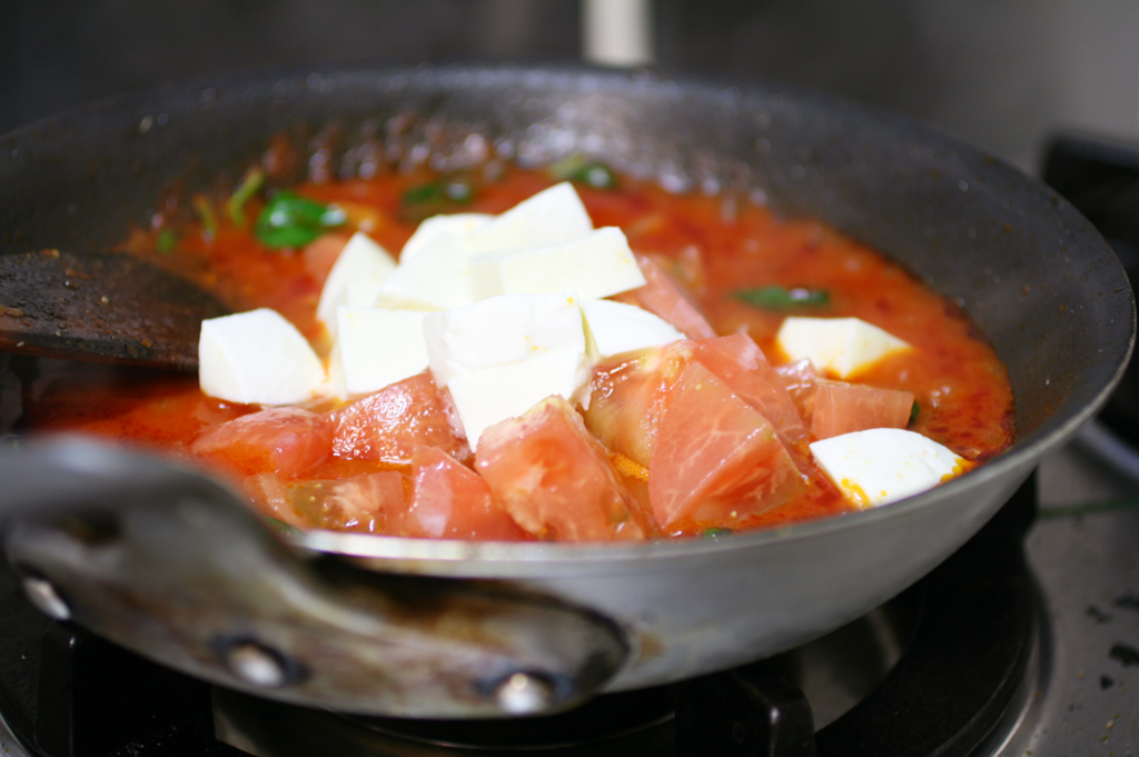 みじん切りにしたねぎとザーサイと挽肉を炒めて、豆腐を入れ、酒、塩、胡椒、醬油で味をつけてたまごでとじて胡麻油をかける。