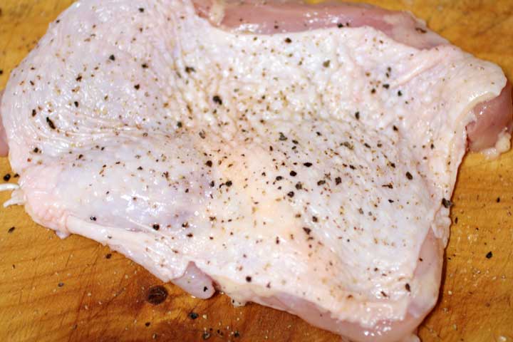 鶏モモ肉は黄色い脂を取り除いて、塩、胡椒をする。