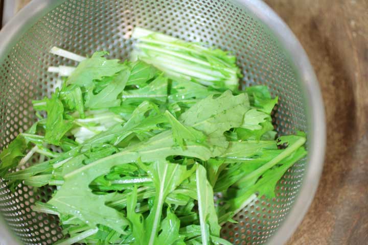 お皿に盛りつけたら、最後に水菜をたっぷり乗せて、完成。
