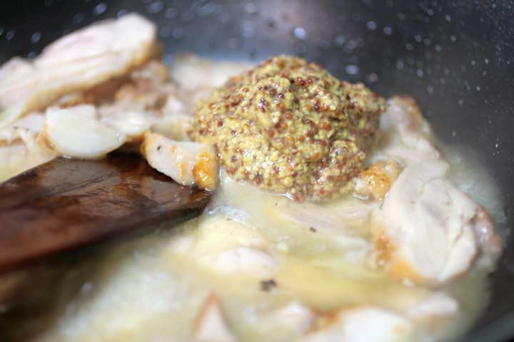 パスタの茹で時間が残り1分くらいになったところで、粒マスタードを入れ、塩、胡椒で味を調える。