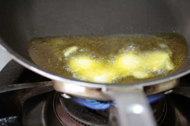 にんにくは皮を取り、包丁の腹で潰し、オリーブオイルで揚げるようにする。
