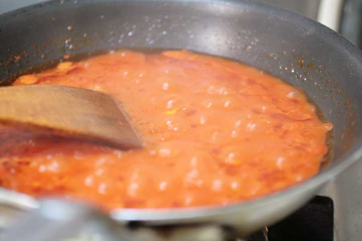 にんにくがきつね色になったら、手で潰したホールトマトを入れ、煮詰める。