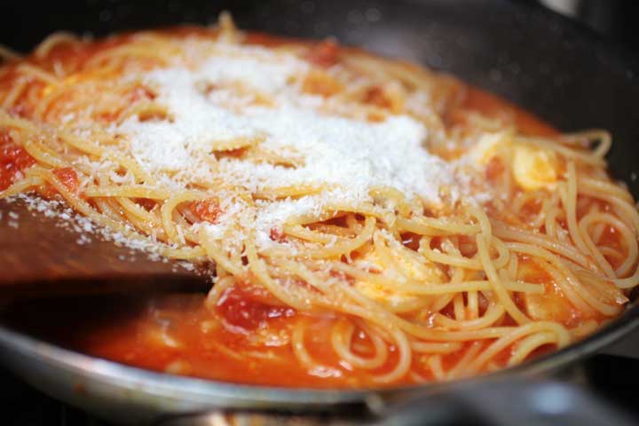パスタが茹で上がる直前にモッツアレラを入れ、茹で上がったパスタを入れ、パルミジャーノ・レッジャーノのすりおろしを入れ、しっかり和えたら完成。