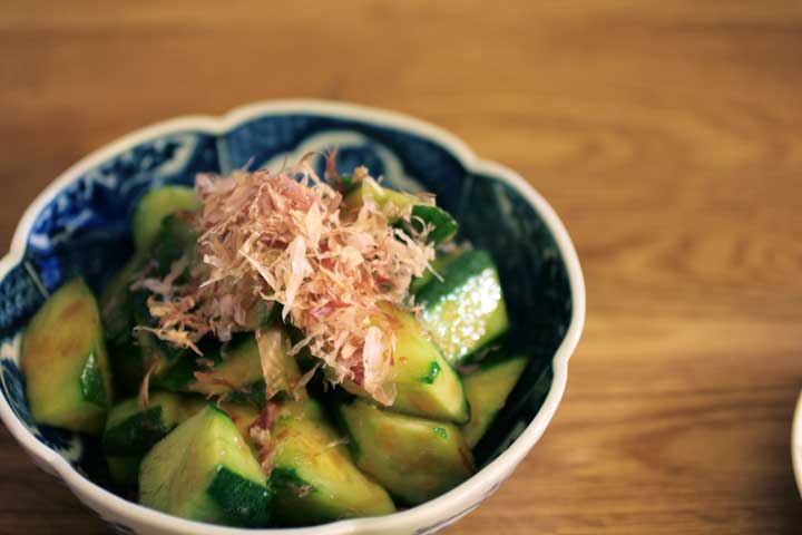 梅肉を包丁で叩いて、めんつゆで溶く。胡瓜と和えたらごま油をまわしかけて、削り節を乗せる。
