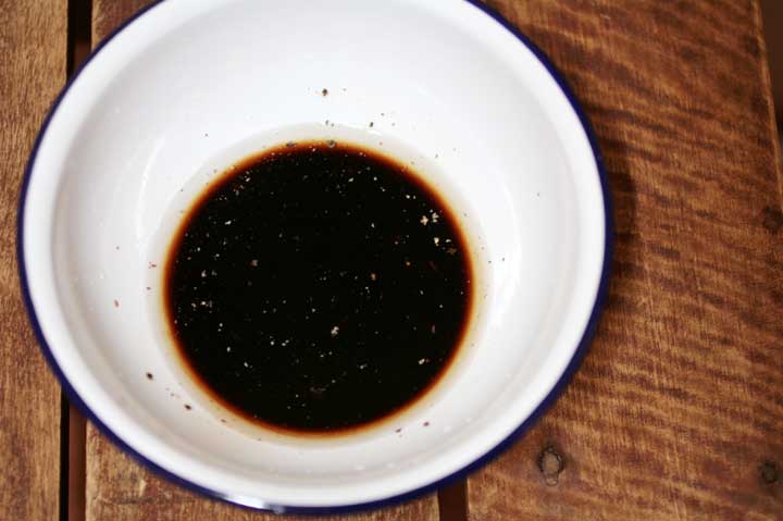 白ワイン、白ワインビネガー、バルサミコ酢、塩、胡椒を混ぜ合わせる。
