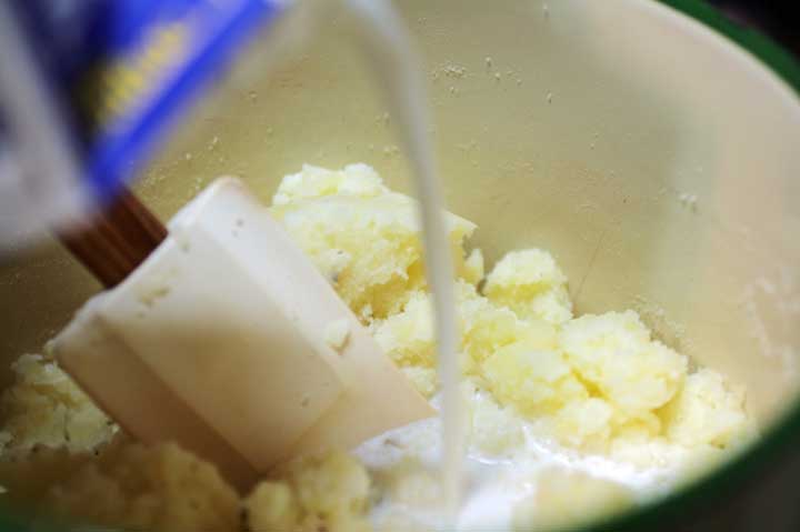 茹でたじゃがいもを熱いうちに潰し、バター、牛乳、塩、胡椒を入れ、ごく弱火にかけながら混ぜる。