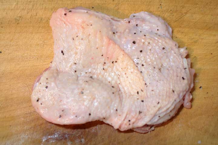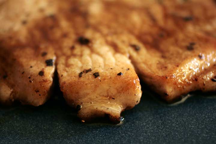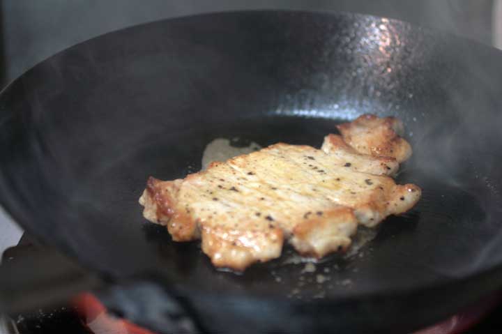 塩、胡椒をして両面を焼き、蓋をして水を入れて蒸し焼きにする。