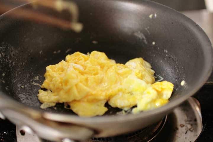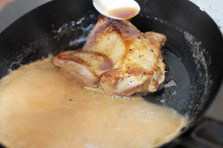 火が通ったら、タレを入れ、フライパンを傾けて、タレをかけながら煮詰めるようにする。