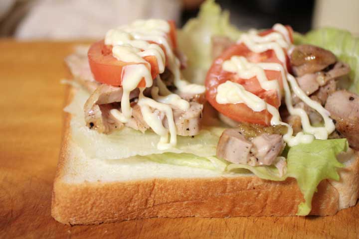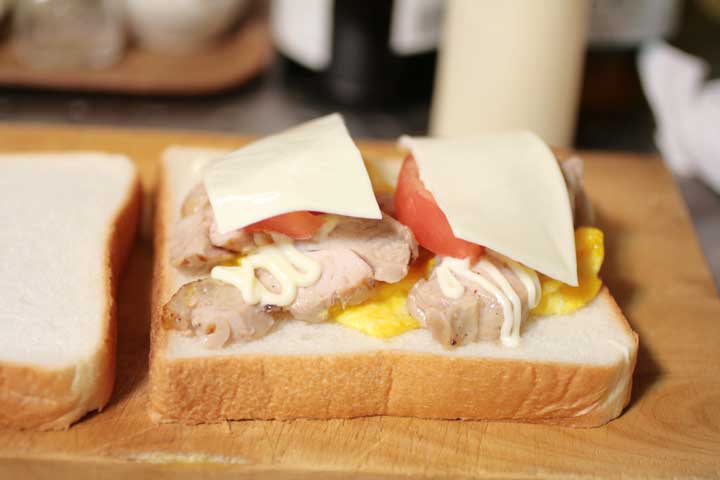 スクランブルエッグ、スライスした鶏肉、トマト、マヨネーズをかけ、胡椒を挽き、スライスチーズを乗せる。