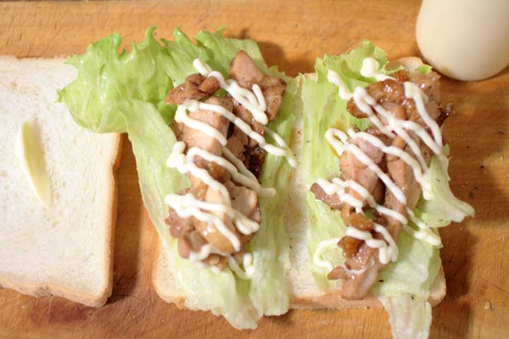 パンにバターを塗り、レタス、スライスした鶏の照焼きを乗せ、マヨネーズをかける。