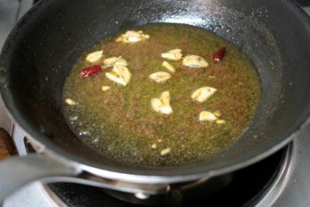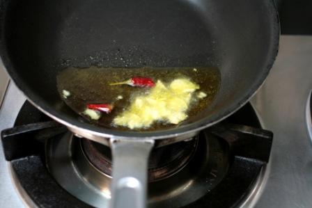 にんにくきつね色になったら、ふたつにちぎって種を除いた唐辛子を入れ、辛味をオイルにうつす。