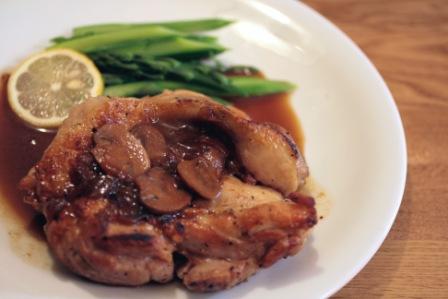 酒、醬油、味醂のたれをかけ、フライパンを傾け、たれをかけながら焼いて照りを出す。