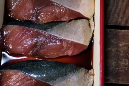 漬け汁に漬けておいたブリを、フライパンで両面焼き、酒をふって蓋をして蒸し焼きにする。