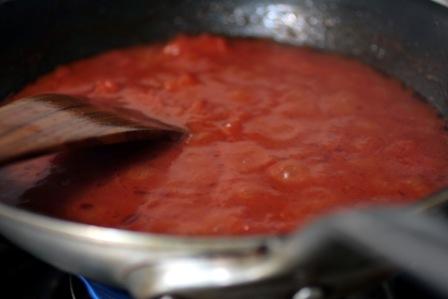 にんにくがきつね色になったら、手で潰したホールトマトを入れて煮る。