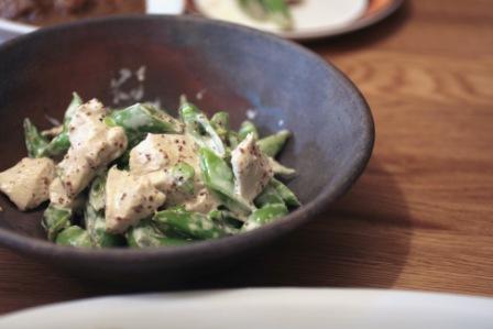 蚕豆と鶏ささみをマスタードとマヨネーズで和えたもの。