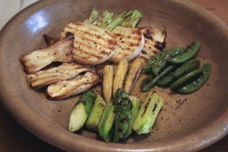 かぶ、スナックえんどう、ヤングコーン、アスパラガス、エリンギをグリルで焼き、塩、胡椒とオリーブオイルをかけただけ。