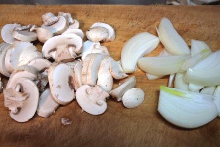 マッシュルームは薄切り。たまねぎはくし型に切る。
