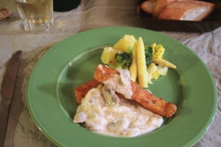 サーモンの切り身を見ていたら、ムニエルでもやってみようかなと思った。冷蔵庫にマッシュルームがあるから、それを使ってクリームソースを作ってかけたらおいしいんじゃないかな、と。