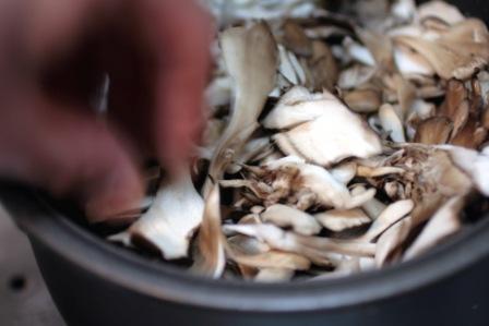 だし昆布、塩、醬油、味醂を入れ、ほぐした舞茸を入れて炊く。