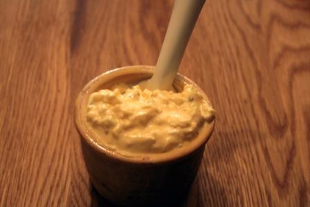 たまねぎのみじん切りとゆでたまごとマヨネーズで即席のタルタルソースを作る。