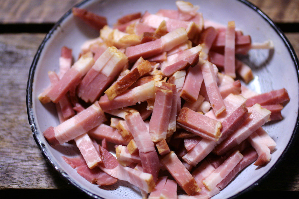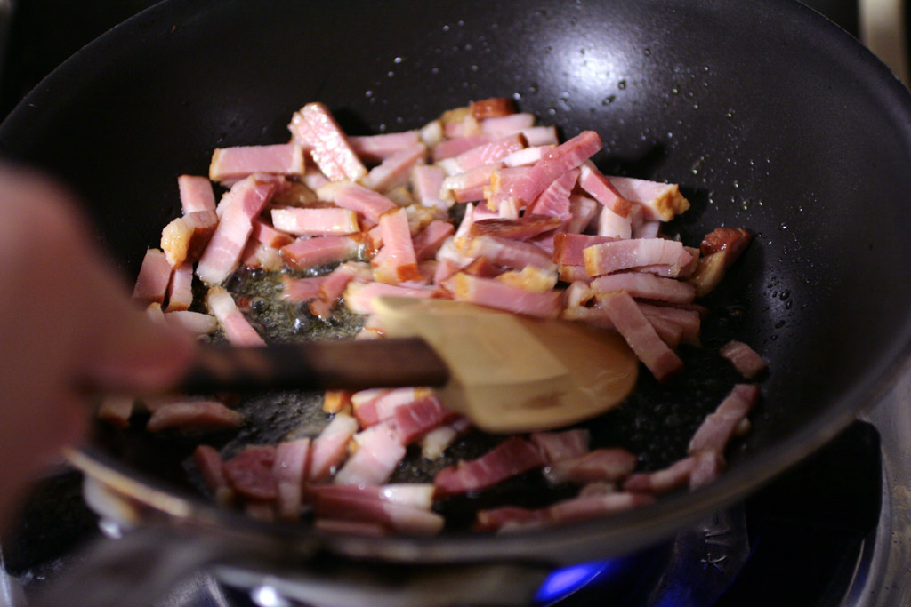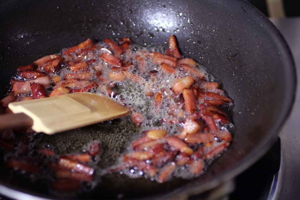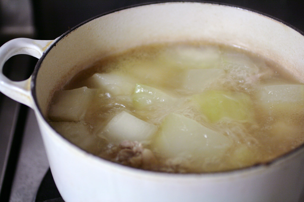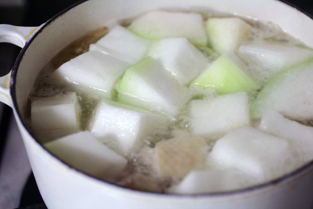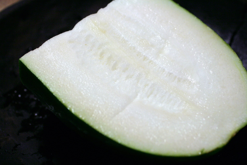 冬瓜は皮を剥き、種をスプーンで掻き取り、ざくざくと切る。