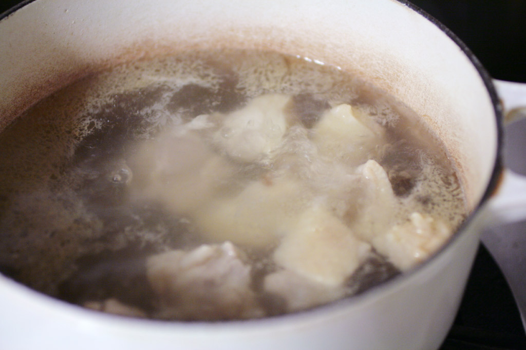 鍋にだし汁を沸かし、鶏もも肉を入れ、煮る。