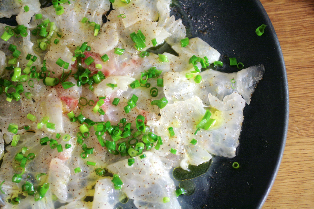 真鯛のさくは斜めに2mm厚のそぎ切りにし、塩、胡椒、レモン。オリーブオイルを回しかけて、小ねぎを散らす。