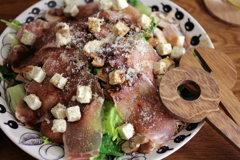 ルッコラとレタス、生マッシュルーム(レモンをかける)、生ハム、キューブ状に切ったクリームチーズ。