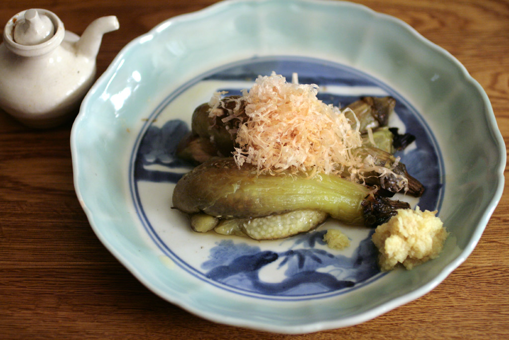 黒くなるまで網で焼いた茄子の皮を剥いて、つけ汁につけておく。