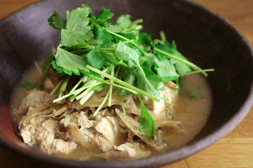 ごぼうと豆腐を煮て、たまごでとじて、三つ葉を乗せる。